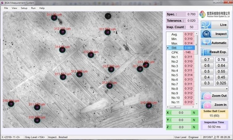 特殊功能 | 1:15倍Zoom伸縮 2:37度內層LED環型光 3:75度外層LED環型光 4:50mm長工作距離鏡頭 5:TTL同軸雷射 6:訊號平行處理 7:中文化界面 |